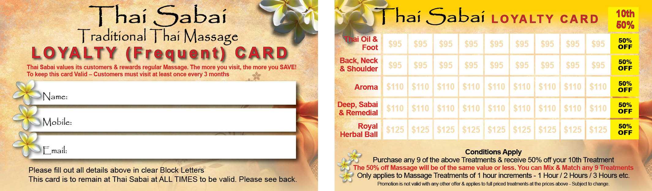 Book your Massage with us today & ask to get your new Thai Sabai LOYALTY CARD where we reward you for frequent massage